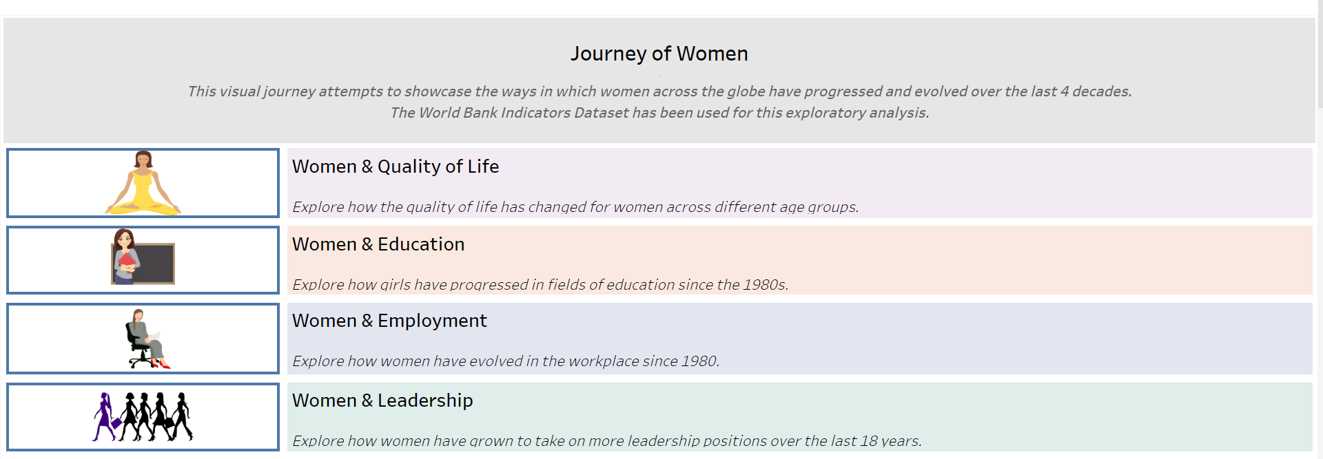 The ‘Journey of Women’ is an exploratory visual analysis built using Tableau based on the indicators related to women from the World Bank dataset. This visual product aims to provide means to learn how paradigms have changed for women globally over the last 5 decades in areas such as education, quality of life, employment, and leadership roles.
